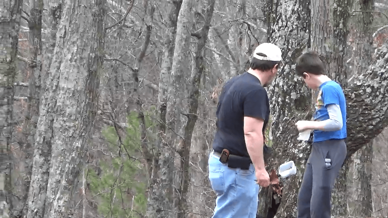 GC2P7NF – Spelling Test – Say What You Believe was the first on the list. When we reached the closest point to the cache, I took the most direct to route straight up a steep bank. I hear snickering from behind me as I struggled to get up the bank(it was difficult to get traction on all the fallen dried leaves). After climbing the bank, the rest of the way to ground zero was fairly level and easily traversed. I spotted the cache quickly, but almost missed it due to a small branch with similar colored leaves hanging from it. About this time. Shelby showed up with the camera (I guess she is the designated camera carrier today)